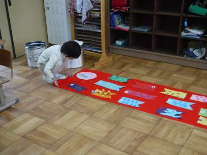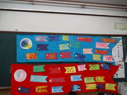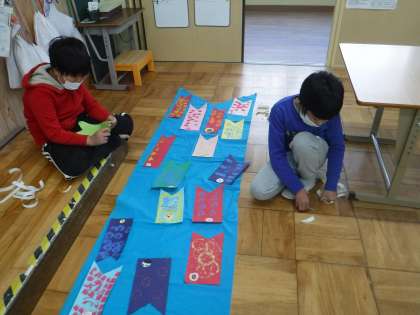 みんなで作ったこいのぼりを大きなこいのぼりにうろこに見立ててつけました。みんな「わあ!」と歓声をあげて喜びました。そらいろの子どもたち,大宮小学校のみんなが元気に過ごせるように願いを込めて!