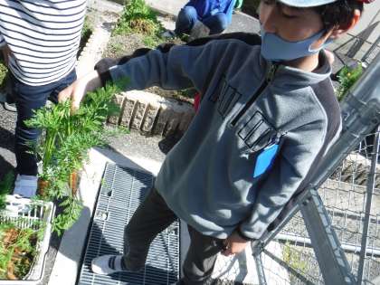 葉っぱは立派ですが,食べられる根っこはどうかな?と思って抜くと!「わあ!きれい!」「おいしそう!」「小さいけどまっすぐ!」とみんなで盛り上がりました!