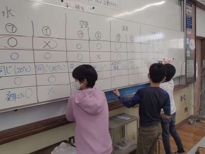 理科では,インゲンの発芽と成長についての実験結果をみんなでまとめました。発芽の条件を調べるために,水・空気・温度・日光のいずれかを除いた環境下で育ててみました。