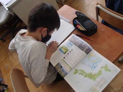 調べ学習の時間には,資料を見て分かることをメモして行きます。新しい知識や予想と一致していることなどに気付く時間です。さらにもう一段階大切なのが「つまり・・・」「ということは・・・」と,自分の考えをもつことです。『日本の国土の4分の3が山地。』ということに気付いたら『ということは,みんな残りの4分の1の平地に住んでいるのかな。山の方が住みやすい人もいるのかな。』など,考えを深めてさらなる興味に繋げるところが社会科の醐味です。