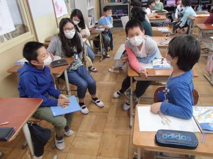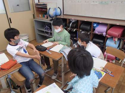 一人学びの後は,班で交流します。資料から分かったことや,そこから自分で考えたことを伝え合います。特に,自分で考えたことは人によって様々な考え方が生まれるので,交流していて一番楽しい時間です。「あ〜確かに!ということは・・・」など,班でさらに深めたり,今まで気づかなかった新しい視点をもつことができたりします。