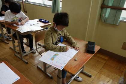 書写ノートを用いて,今日はカタカナの形を学習しました。覚えているつもりでも意外と形が崩れているものです。改めて文字の形を確認し,一画一画,カタツムリの速さで書きました。子どもたちが集中を持続できるのは5分程度でしたが,少し書いては休み,休んでは書いて,美しい文字を書くことができました。