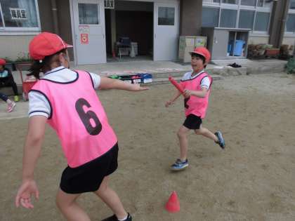 体育では,リレーあそびの学習が始まりました。