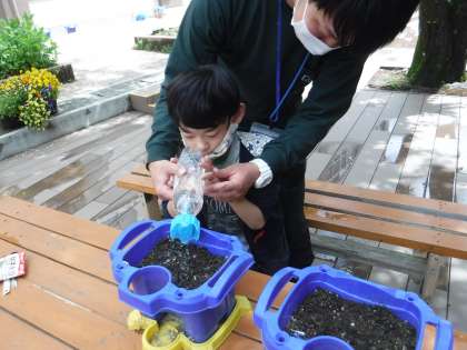 3年生は,大豆の種をまきました!「大きくなあれ!」水もたっぷりとやりました。