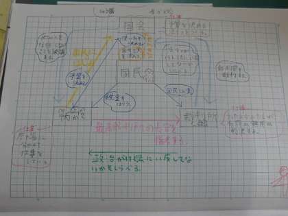 授業の最後には,今までに学習したことを振り返り,三権分立について子どもたちと考えました。