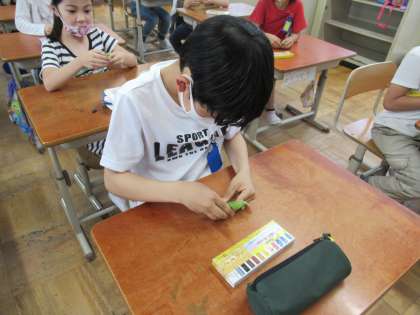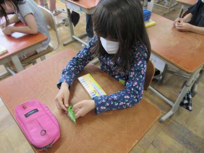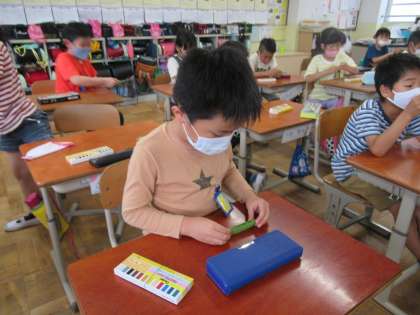図工の学習では,地域の畑の先生にいただいたお野菜を使って絵を描きました。