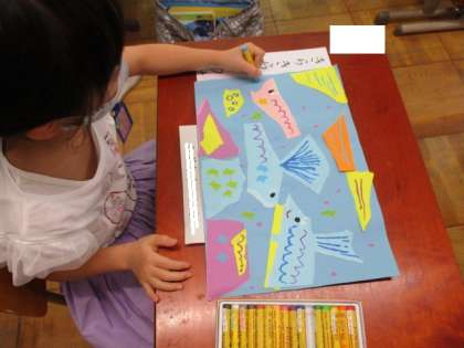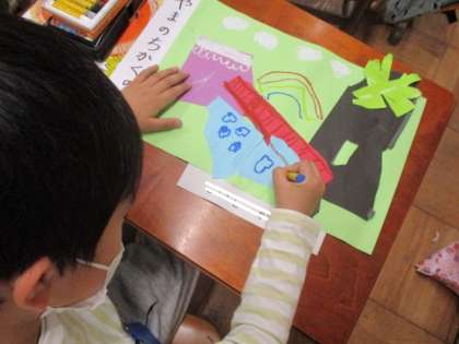 ならべて貼った紙に,パスで顔や模様,景色を書き足しました。