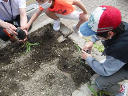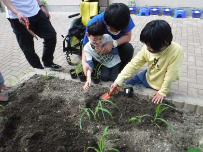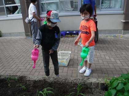 ポットに種をまいて育てていましたが,今日は,畑に植え直しました。その後,水やりもしました。去年,立派なトウモロコシができたので今年も大きくなってほしいです!