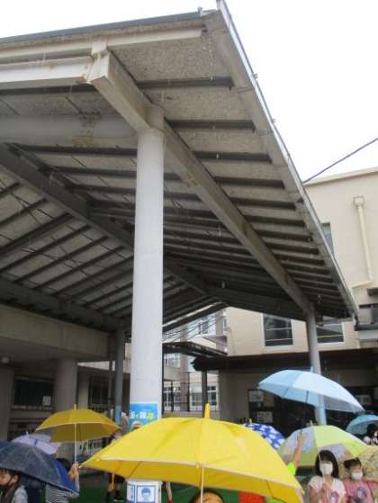 屋根から落ちてくる雨水が傘に当たる音を,交代で聴いていました。
