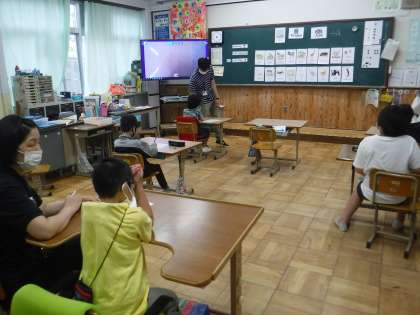 今日の外国語活動では,動物(18種類)の名前が話せるように学習しています。カバやシマウマ・キリンなど難しい名前も出てきます。