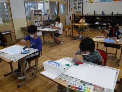 図画工作で「ぼくのすきなせかい」を制作しています。今日は,台紙作りや好きなものをどうはるかレイアウトを考えたりしました。