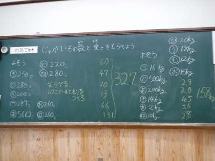 みんなの予想よりもたくさんのジャガイモが収穫できました!重さは,2キロのペットボトルを持ってみて見当をつけて予想しました。重さもみんなが思ってたよりも重かったです。327個15,8キロでした!今年は,大豊作でした!
