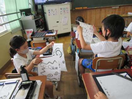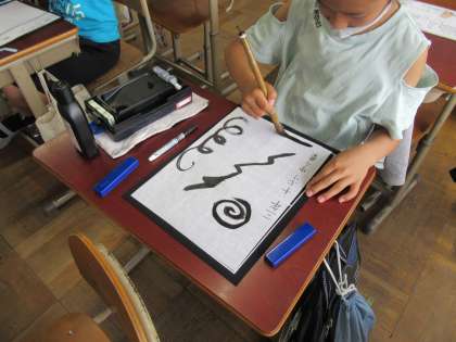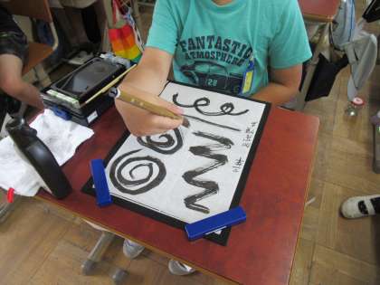 今日の書写の学習では,筆を使っていろいろな線を書きました。