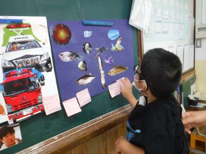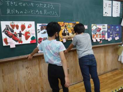 図画工作で取り組んでいる「ぼくのすきなせかい」の鑑賞会をしました。自分の作品の説明をした後,友だちのよいところを書いてはっていきました。書いてもらったメッセージを嬉しそうに見ていました。