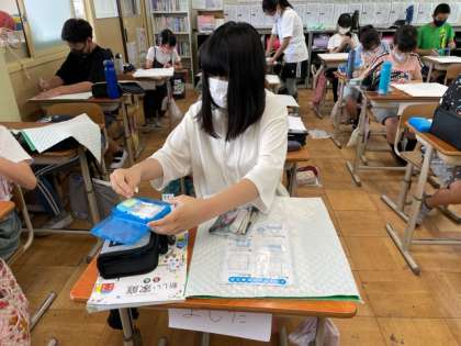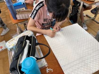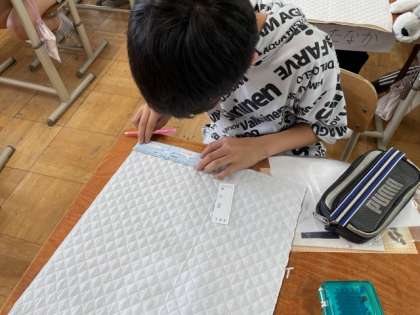 子どもたちは,自分の選んだ生地に印をつけて,一生懸命返し縫いをしていました!