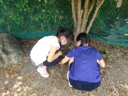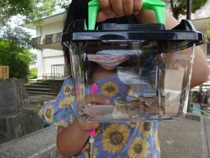 生活科「小さな友だち」で,ダンゴムシやちょうちょうをつかまえました。ダンゴムシはしめったところが好きだから,一緒に入れた砂に水をかけたり,虫たちが喜ぶように葉っぱを入れたり,工夫を考えて,虫かごに生き物を集めました。