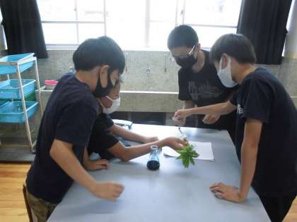 授業では,植物染色液にホウセンカの根の部分を浸して水を吸い上げさせた後,茎や葉の付け根などを切って,双眼実体顕微鏡で青く染まっているところを観察しました。