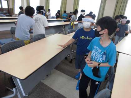 総合の学習では目の不自由な人はどのような思いで生活をしているのかに気付くためにアイマスク体験をしました。