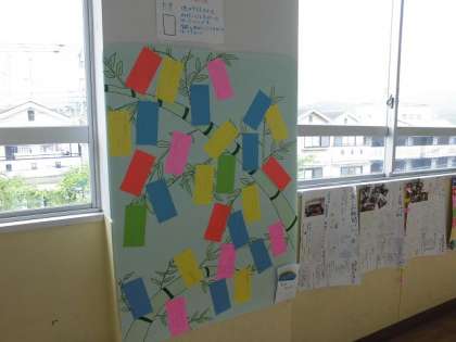 新聞係の子たちが,七夕にちなんでみんなの願い事を書く企画をやっていました。