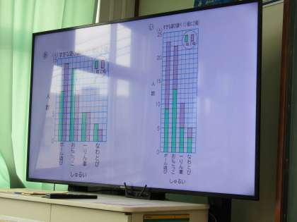 同じデータが表されている2つのグラフを見比べて,違いや見やすさについて考えました。目盛りの大きさが違うことや,棒グラフを並べたり,合体させたりして工夫を加えると,いろいろな場面での読み取りやすさがあることを話し合いました。
