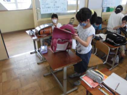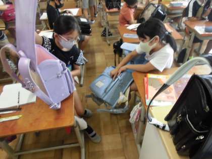そこで大宮小の卒業生のランドセルを見せました。(協力してくれてありがとう卒業生!)