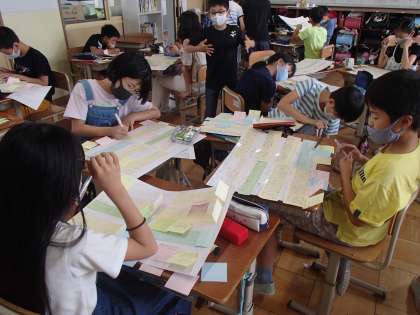 国語の学習では,身の回りの「みんなが過ごしやすくなる工夫」について調べ,友だちに報告する文章を書きました。清書の前に友だちどうしで読み合い,改善点を伝えました。よりよい文章となるように,何度も読み返すことが大切ですね。