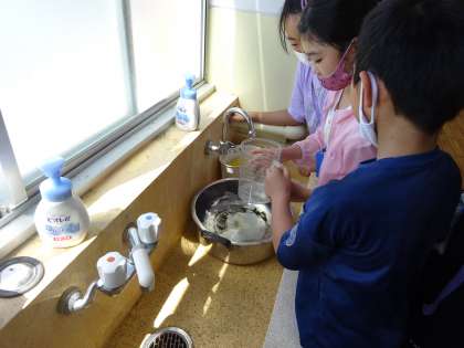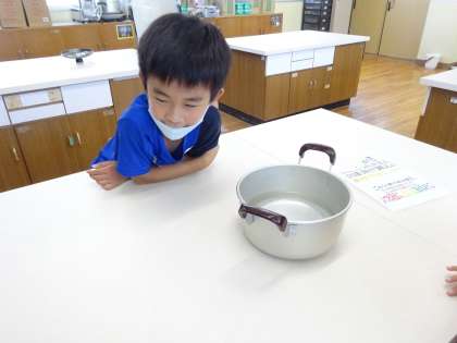 今日は,1リットルだと思う量の水をなべに入れてみました。1リットルますにうつしかえてみると,いいぐらいの量を入れられている班が多くてびっくりしました!