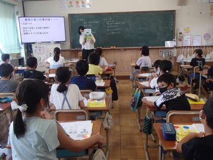 5年生の夏休みの学習では,読書感想文に取り組むという課題があります。休みに入る前に,図書館教育に詳しい先生から「読書感想文を書く時のおすすめポイント」を教えていただきました。読み進める際にポイントとなるのが,本の内容と繋がりのある自分の経験や,「もし自分なら〜」という視点をもって読むことです。また,思いついたことをパッとメモに取ると,後で「書きたいこと」を整理する際にとても便利です。ぜひこの長い休みに,本の世界にじっくり浸ってみて下さいね。