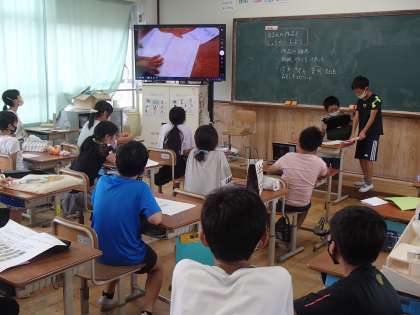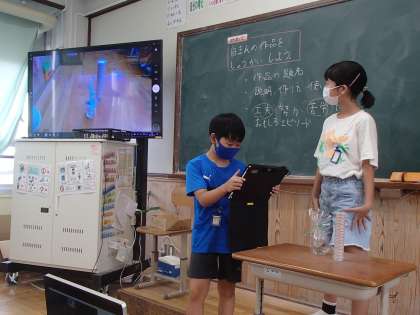 2日目の今日は,みんなが夏休みの間に取り組んだ,自由研究・工作の発表会をしました。次の発表者がカメラマンになって,テレビに作品を映しながら,みんなが細かい部分まで見えるようにお手伝いをしました。一つ一つの作品に愛着を感じた素敵な発表会になりました。