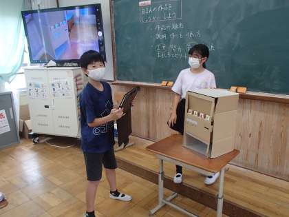 調べ学習や理科の実験,工作や絵画など,楽しい自由課題の作品が並びました。自分の作品のこだわりの部分や苦労したこと,工夫したことを上手に説明しました。