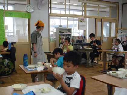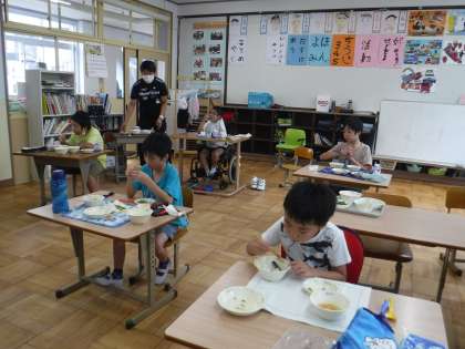 そらいろの子どもたちは,マスクを外して給食を食べ始めるとお話をやめて食べ始めます。朝の挨拶で「魚が苦手やけど食べる!」「枝豆は好きなので多めにしてください!」と話していたので栄養教諭のS先生が様子を見に来てくださいました!「わあ!静かにしっかり食べているね!」「ごはんきれいに食べたね。ごはんつぶが残ってないね!」とほめてもらいました。