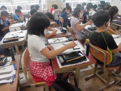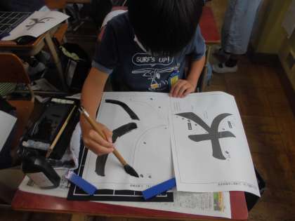 「トン・スー」と筆をゆっくりと動かして,はらいの練習をしました。