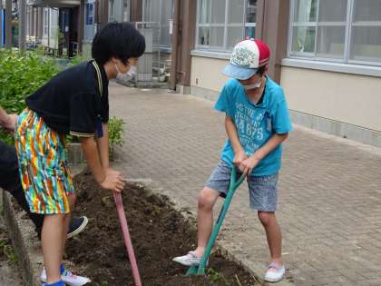 冬野菜を植えるために土作りをしました!イエローポップや大葉とバジルもぬいてその後,肥料を入れて準備をしました!4年生が頑張って耕してくれました。
