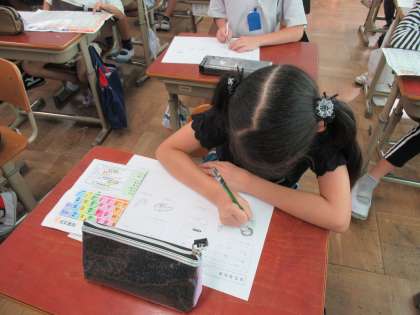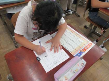 1学期の後半から,少しずつローマ字の学習をしています。タブレットを使ってのタイピング練習も,ローマ字うちでできるように頑張っています。国語科では,書く学習が中心です。間違えないように,ローマ字表をしっかり見て言葉づくりをしました。