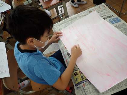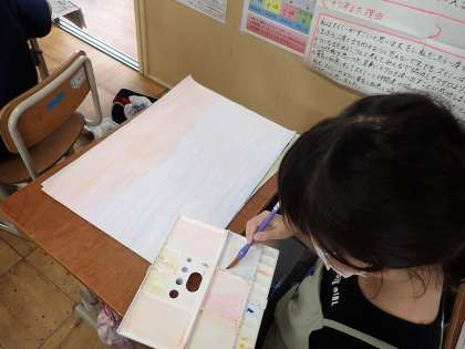 お話の絵の続きをしています。背景に薄く色を薄く塗ってから,下書きを描き始めました。来週から本格的に色塗りです。どんな色合いの世界を表現してくれるのか,とても楽しみです。
