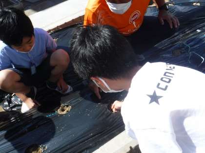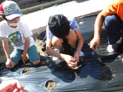今日は,地域の畑の先生に大根の種のまき方を教えてもらいました。「指で穴をあけてそこに種を3粒入れて優しく土をかけるといいよ。」と優しく教えていただきました!