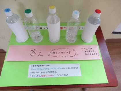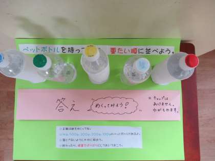 3年生では,重さの学習をしています。どのぐらいの重さなのか体感するために,ペットボトルに入った水は何グラムなのか?というクイズが…さてあてることが出来るでしょうか?