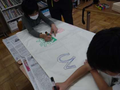 そらいろは,SDGsのことを学習しています。普段していることがSDGsと繋がっていることがいっぱいあることがわかりました。SDGs隊という名前で活動しています。今日は,旗を作りました。字を書く4年生,絵をiPadで描く2年生。どんな旗になるのかお楽しみに!