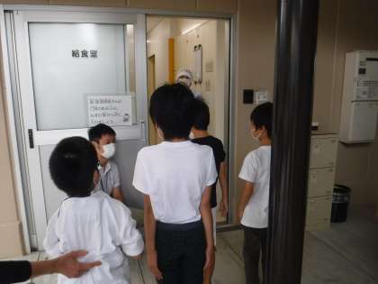 給食室へ挨拶に行きました。「おはようございます!今日もよろしくお願いします!」と挨拶すると「みんな元気でしたか?」と調理員さんから温かい言葉をかけてもらいました。