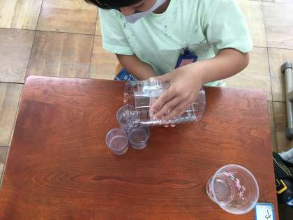 同じ大きさの小さなコップを使って,いくつ分になるか調べました。