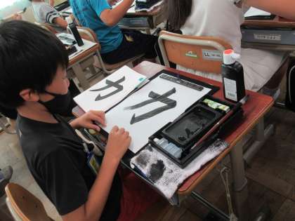 お習字も随分慣れてきました。「二」では横画・「つち」では縦画・「大」でははらいを学習をしました。今回の「ちから」では,「おれ」と「はね」を練習しました。