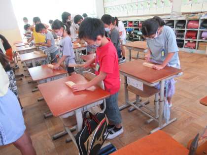 はじめての「くぎうち」です。けがをしないように,みんな慎重に,そして緊張して練習しました。真っすぐに打ち込むのはなかなか難しいね。