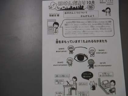 養護教諭になるために教育実習に来ている先生が,そらいろで「10月のほけんだより」目の健康について考えよう!について教えてくれました。目に優しい生活の仕方や見直したいポイントについて話を聞きました。お薬の飲み方クイズもしました。最後にみんなでかいたカードを渡しました。元気でがんばってくださいね!