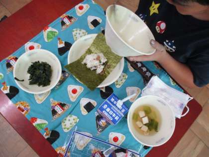 今日の給食は,肉みそ納豆とごはんを手巻きのりで巻いて食べました。