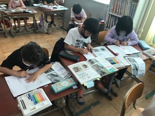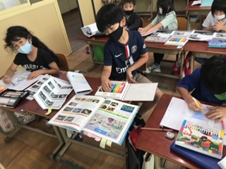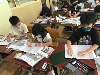 1年生の国語で「うみのかくれんぼ」を学習しました。学習の後半に,自分の好きな生き物を選び,三角ポップを作成しました。文章を丁寧に書き,かくれんぼの前と後を写真付きで紹介します。