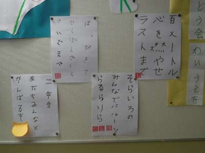 いよいよ明日は,スポーツフェスティバルです!今日は,リハーサルでした。少し緊張していましたが,頑張りました。国語の時間に意気込みを俳句にしました。3校舎東側の掲示板にはってあるので見てくださいね。