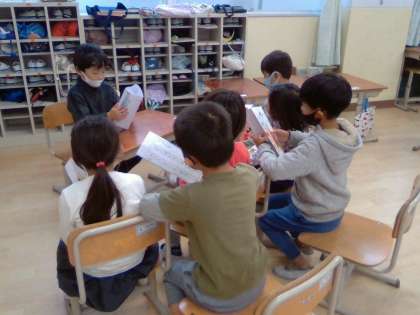 グループごとに,お友だちが一生懸命作ったかくれんぼタワーを見ながら,発表している人のお話を熱心に聞くことができました。