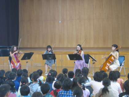 御所南ヴァイオリンスクールからゲストティーチャーの方に来ていただき,ヴァイオリン・ヴィオラ・チェロの演奏を聞かせていただきました。