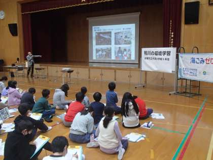今の鴨川が抱えている課題についても教えていただきました。ゴミのポイ捨て,外来生物の駆除,海へ流れ出るプラスチックゴミなど,まだまだ私たちが取り組むべき問題があります。教室で行われる学習で留まらず,自分たちの力で現状を変えたいと思う気持ちが,今後の学習の糧になって行きます。