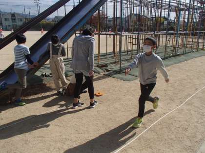 自分の歩幅が分かったら,次は歩幅を使っていろいろな距離を測りました。総合遊具の周りなど,自分の歩幅を知っておくと何かと便利ですね。